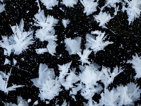 Frost crystals form an intricate pattern on a dark surface during a chilly morning, showing natures beauty and the chill of winter.