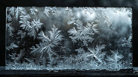 Intricate ice crystal formations on frozen windowpane, abstract macro photography, cold morning light.