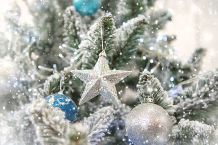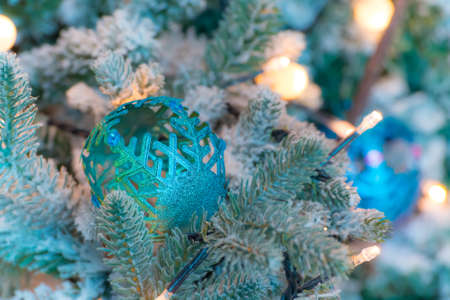 Christmas tree decoration with blue bauble and snowflakes on blurred background