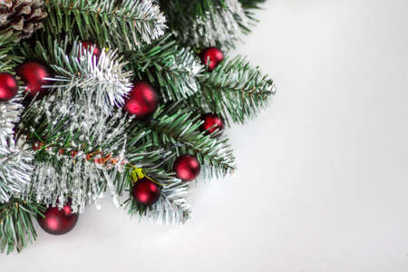 Christmas background with frosted evergreen branch and red balls on white background with blank space