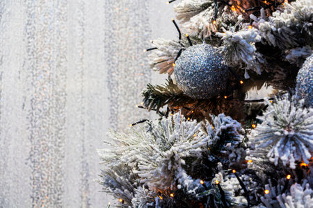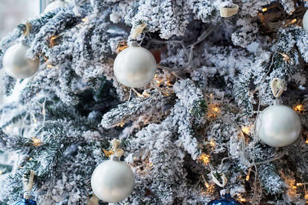 Closeup of Christmas tree decorated with white baubles and garland near window, copy space. Christmas decorations. Holiday background. Christmas tree. Greeting card