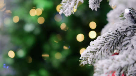 Green Christmas tree with red balls and bokeh. Selective focus. Christmas background.