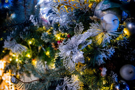 Traditional artificial Christmas tree with Christmas toy, ball and glowing colorful lights in background. Xmas concepts. Close-up of Christmas tree. Defocused background.