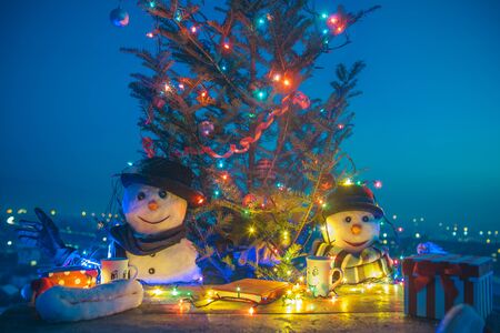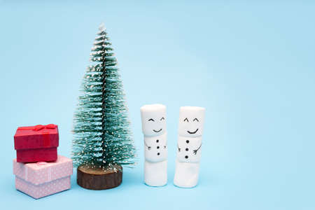 Christmas card snowmen near a Christmas tree with boxes of gifts. Christmas concept.