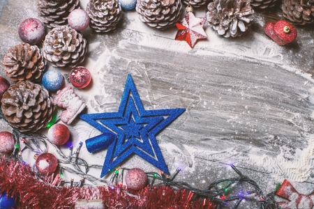 Christmas and New Year holidays background, winter season. Christmas greeting card with ornaments and lights for tree.