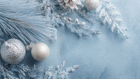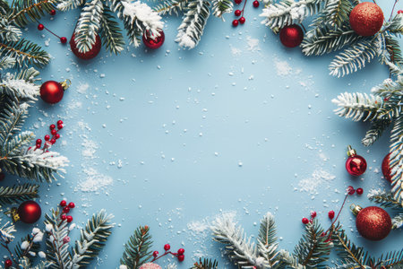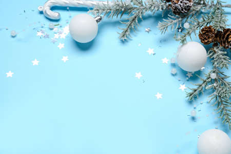 Christmas frame banner with Xmas balls, fir tree twigs in snow and copy space on blue background. New Year festive theme.
