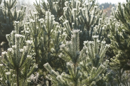 Pine branches in hoarfrost late fall day