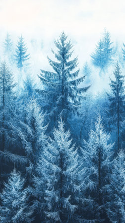Isolated pine tree in snowy forest a serene winter landscape with misty blue hues