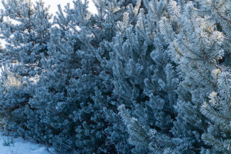 Pine tree branches covered with hoarfrost. Winter background.