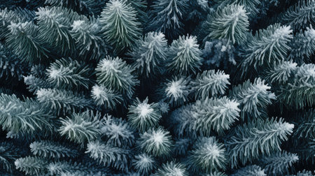 Close-up of frosty pine needles glistening with water droplets on a winter's morning