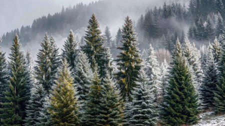 Misty fog in pine forest mountain slopes winter