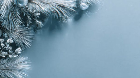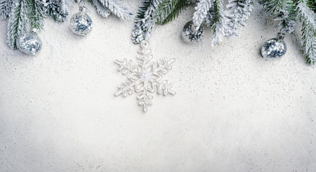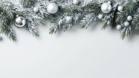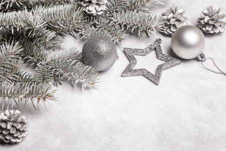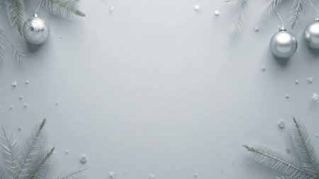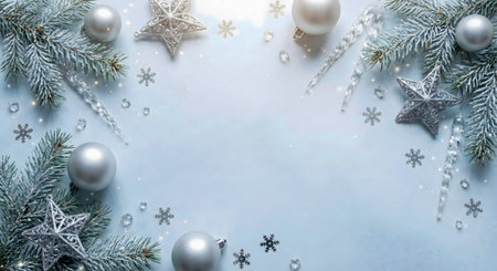 Elegant winter background with silver Christmas balls, stars, and frosty fir branches. Bright space for text or product. Perfect for holiday marketing, greeting cards or banners