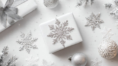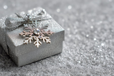 A beautifully wrapped silver gift box featuring a snowflake decoration, placed on a shimmering surface, evoking a joyful holiday spirit and festive celebration
