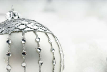 Silver christmas bauble with crystals surrounded by fluffy snow