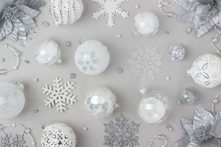 Holiday pattern made silver and white shiny christmas decorations on gray background. Happy Christmas, Xmas and New Year concept. Top view, Flat lay.