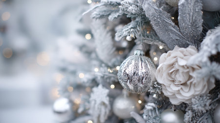 A stunning close-up view of an elegant Christmas tree adorned with frosted ornaments and delicate floral accents, creating a captivating holiday atmosphere filled with joy.
