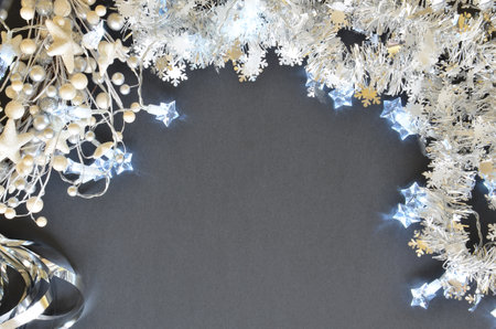 Christmas background with silver and white decorations on gray. Top view with copy space.