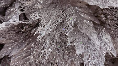 Abstract macro of silver glittery mesh fabric. Frozen lace Christmas decoration texture background