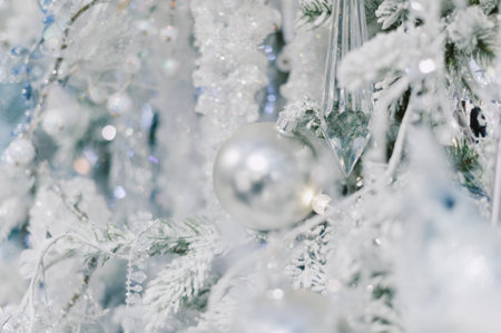 Elegant winter decoration featuring snow-covered pine branches adorned with silver ornaments, perfect for setting a festive holiday mood or creating seasonal designs.