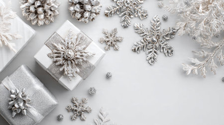 A beautifully arranged festive composition featuring silver ornaments, pine branches, and elegant gift boxes on a soft backdrop, perfect for enhancing holiday themes and moods.