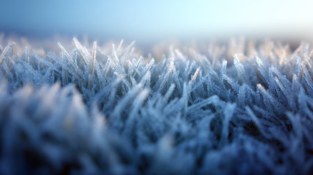 Close-up view of frosty grass blades illuminated by early morning light, showcasing intricate frost patterns and the beauty of winter's delicate textures in nature.
