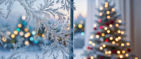 Frosty Window with Christmas Tree and Holiday Lights in Background