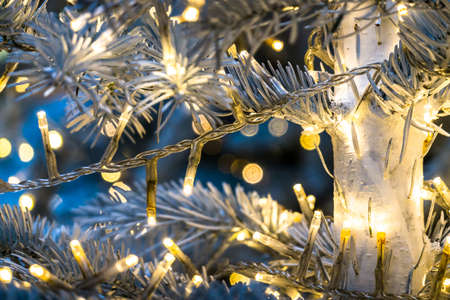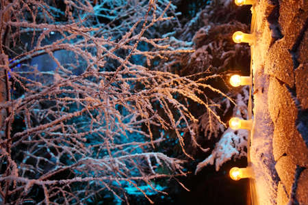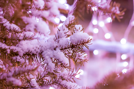 Christmas and New Year holiday background. Close-up of a Christmas tree in the snow against a background of bright lights. Snow