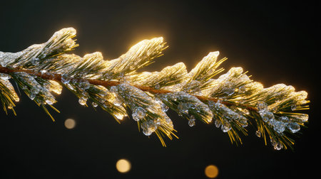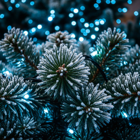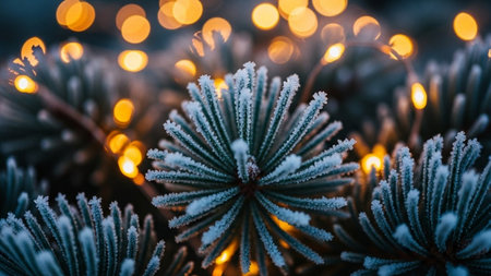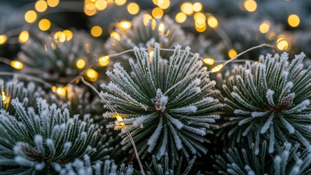 A picturesque winter scene featuring frosty pine branches with delicate snowflakes and warm glowing lights, creating a tranquil and magical atmosphere in the snow.