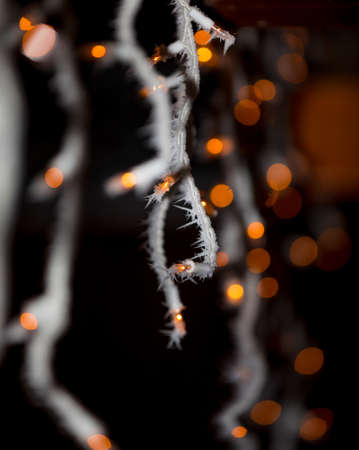 white christmas lights on roof against dark background with icing and hoarfrost and snowfall