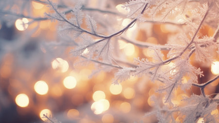 A close-up view of frosty branches illuminated by soft fairy lights, creating a serene atmosphere ideal for winter-themed projects and festive event decorations.