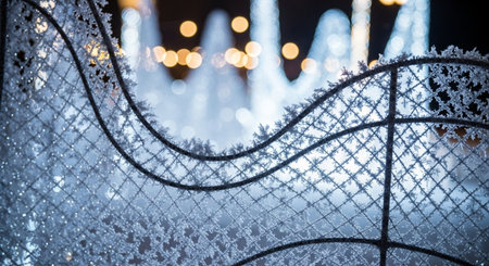 Discover a peaceful winter scene featuring delicate frosty branches illuminated by twinkling lights, evoking a serene holiday atmosphere in an urban setting.