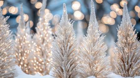 A close-up view of several small, frosted Christmas trees adorned with delicate white lights, set against a soft, bokeh background of warm lights.