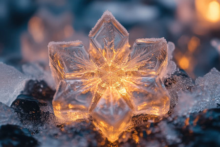 A stunning ice sculpture shaped like a snowflake glows with warm light, resting on a bed of glistening frost. The delicate icy details shimmer under the cold winter atmosphere, creating a captivating winter scene.