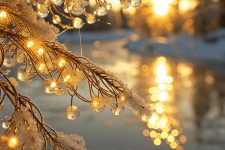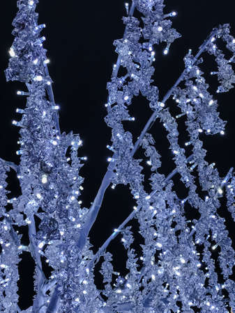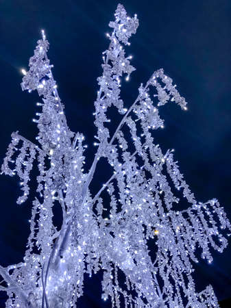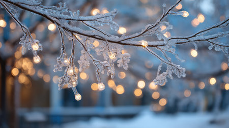 Delicate icy branches embellished with glowing lights create a striking winter scene. This enchanting image captures the spirit of the holiday season in nature.