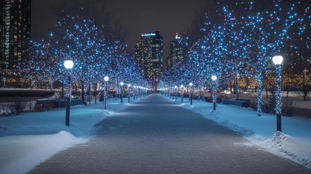 A serene winter night scene featuring a snow-covered walkway adorned with glowing blue lights from trees. The city skyline serves as a stunning backdrop.