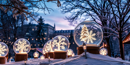 A captivating winter scene showcases illuminated snow globes filled with intricate snowflakes and pine trees, creating a magical holiday atmosphere.