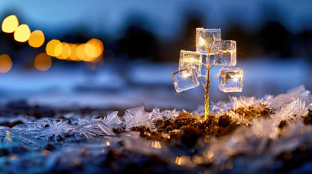 This captivating image showcases an artistic mini tree crafted from ice cubes, surrounded by delicate frost in a tranquil evening setting. The interplay of light and texture evokes a sense of wonder and serenity.