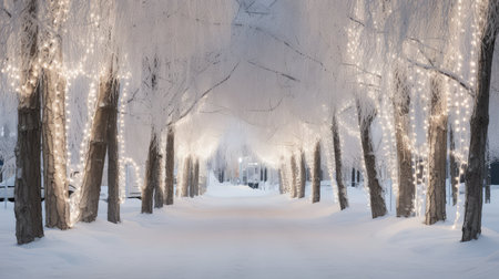 Enchanting winter scene with snow-covered branches adorned with glowing lights. This serene landscape captures the beauty and magic of the winter season.