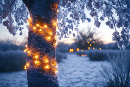 Soft, glowing lights adorn a frosty tree at twilight, casting a warm hue on the snowy ground nearby.