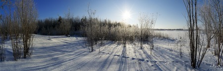 Panorama of winter trees in a cold sunny day