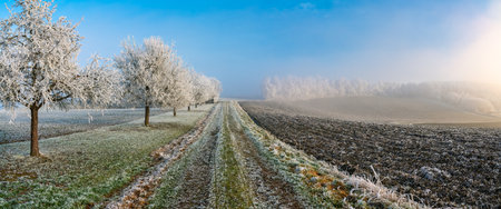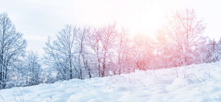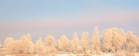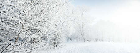 Frosty winter landscape with trees covered in ice and snow on a cold morning. Ideal for Christmas cards.