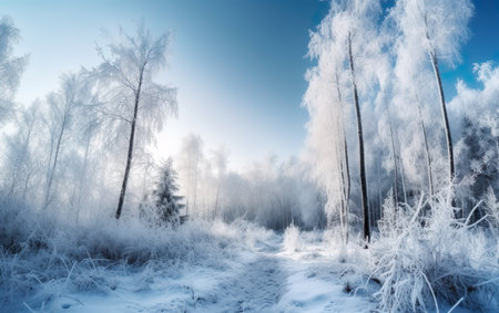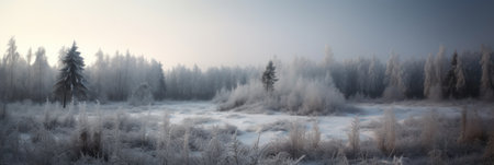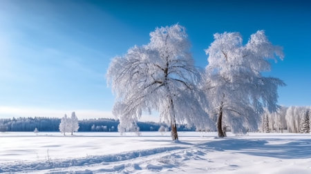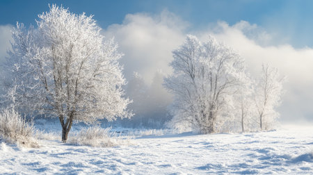 Serene winter landscape featuring frosted trees and blanket of snow, creating tranquil and peaceful atmosphere. scene captures beauty of nature cold season, evoking feelings of calm and stillness