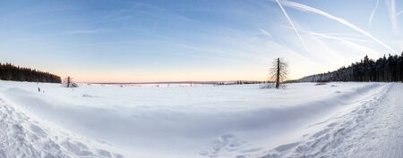 Winter landscape with forest panorama at sunny evening