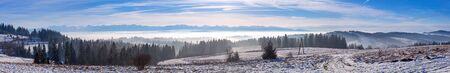 Winter landscape in the Sudetes, white snow covers the field and trees on a clear day.