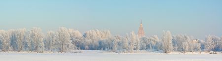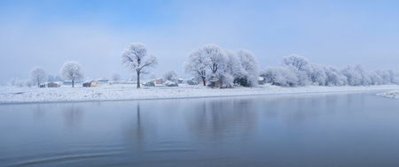 Winter landscape with river and trees in hoarfrost. Winter nature