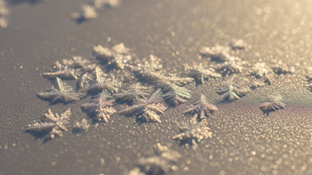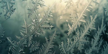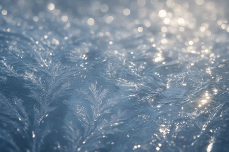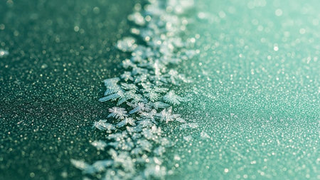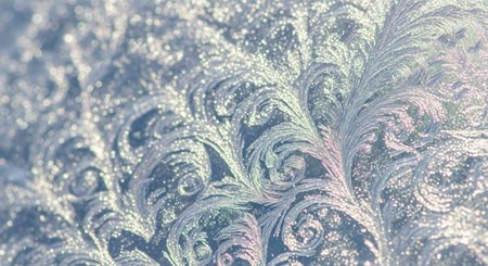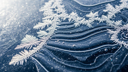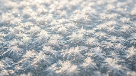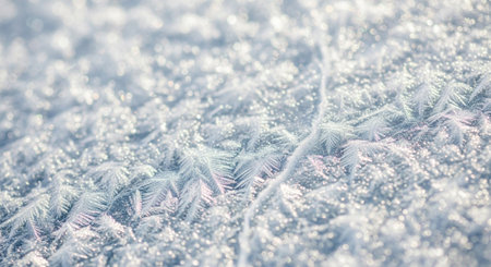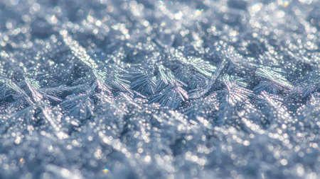 Detailed macro view of sharp ice crystals and frost patterns sparkling in the light