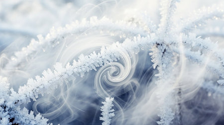 Close-up of frosty branches with swirling mist creating a delicate winter pattern.