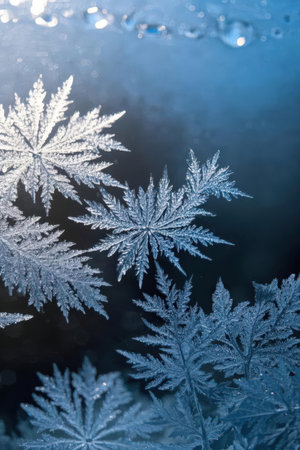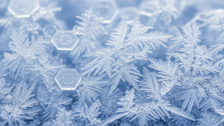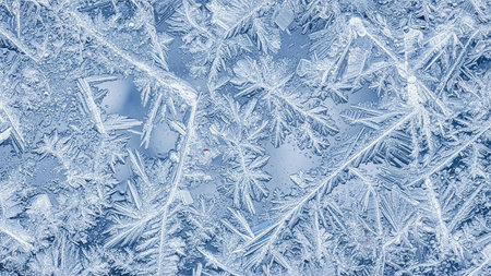 Intricate ice crystal formations display sharp geometric patterns and delicate crystalline structures on a cool blue...