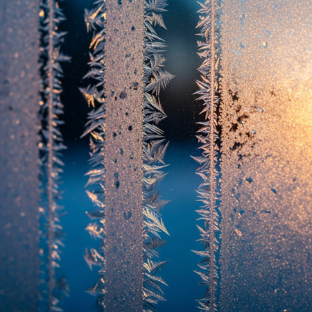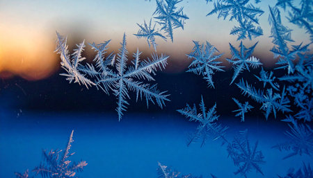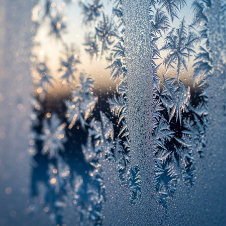 Delicate snowflakes form intricate frost patterns on the glass, capturing the first rays of warm sunlight on a chilly winter morning, creating a mesmerizing display of nature's art.