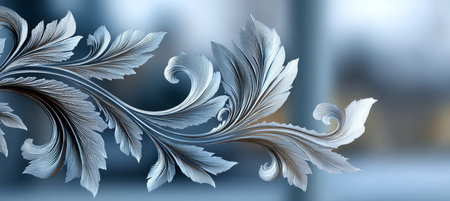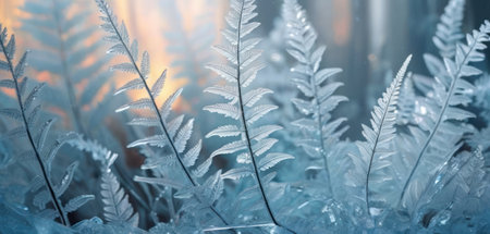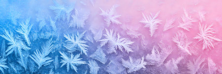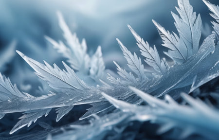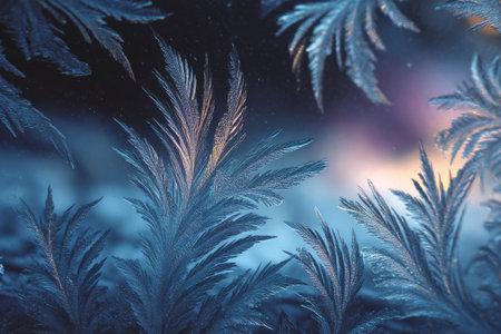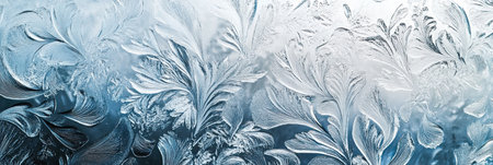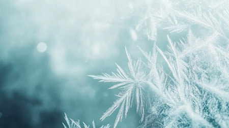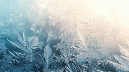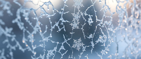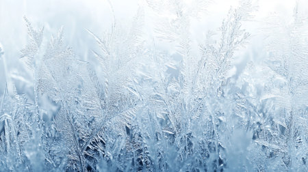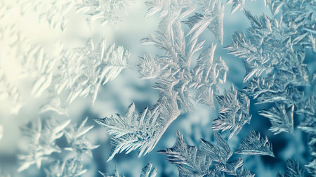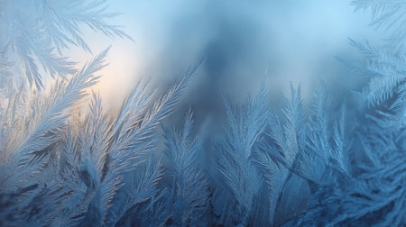 Captivating frost patterns adorn a serene winter scene, showcasing delicate ice crystals against a soft blue background, evoking tranquility and beauty.